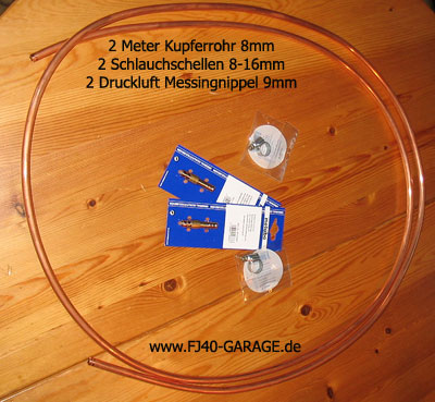 Auf in den Baumarkt und dann wird eingekauft!2m Kupferrohr 8mm biegsam! 2 Messing Stecktüllen für Druckluft. 2 Schlauchschellen 8-16mm VA |