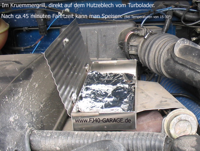 Fertiggericht in einer Aluschale, notfalls mit Draht direkt am Auspuffkrümmer befestigt. Ich hab das schon mit diversen Opel, VW und Mercedes Modellen praktiziert. |