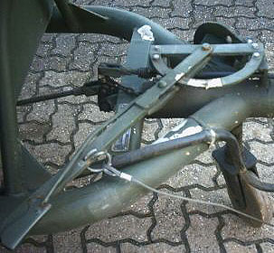 Hier sieht man die höhenverstellbare Zugdeichsel, in diesem Fall mit einer sogenannten Nato Öse bestückt. Das Vorderteil gibt es in allen bekannten