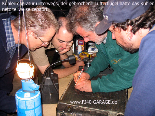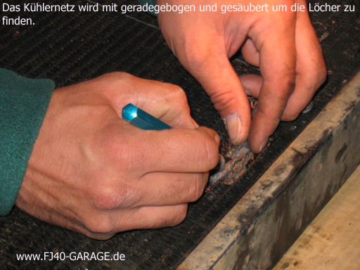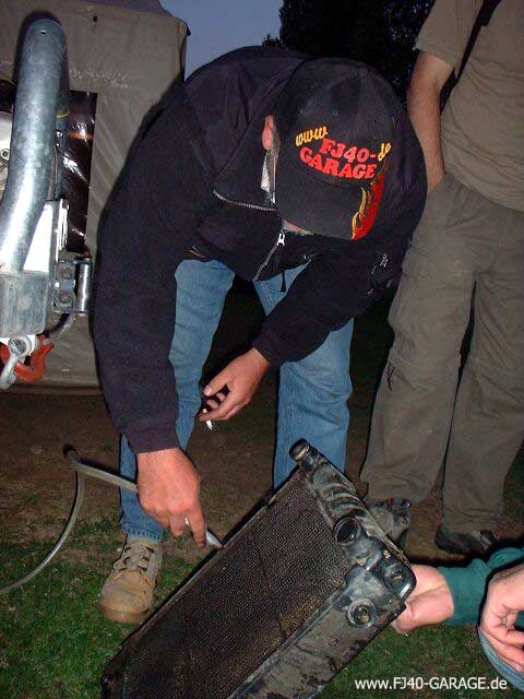 Das Beispiel zeigt einen Land Rover Kühler, der bei einer wasserdurchfahrt durch die Flügel des zerstörten Lüfterflügels perforiert wurde.