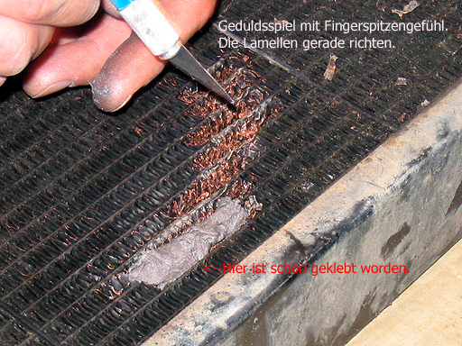 Wir haben den Kühler vorher selbstverständlich gereinigt und getrocknet, repariert wurde mit einem Knetmetall Stick, die hat mittlerweile jeder Baumarkt im