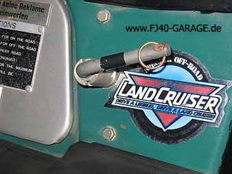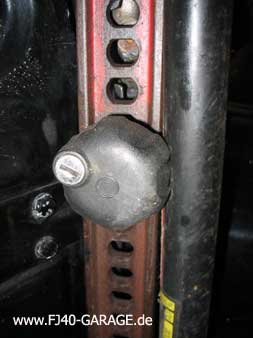Der Hi Lift Wagenheber steht auf dem rechten Trittbrett und wird im Gewinde des Scheibenrahmens mit einer abschliessbaren Knebelschraube gesichert.